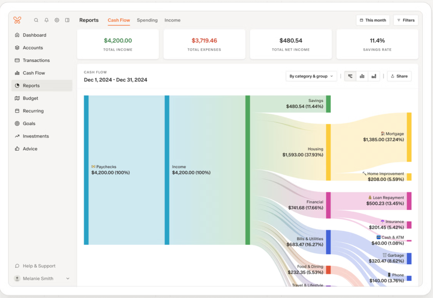 Another area where Monarch stands out is reporting. It offers more robust and visually appealing reporting than YNAB, including the fan favorite Sankey diagram that helps you clearly visualize your cash flow. Monarch also features a customizable dashboard where you can track your credit score and monitor the performance of your investment accounts, which are capabilities not currently offered by YNAB.